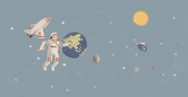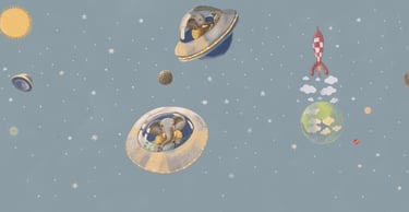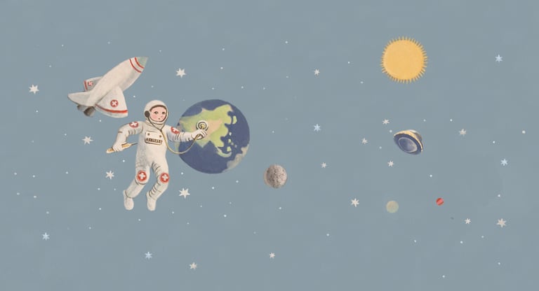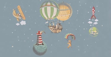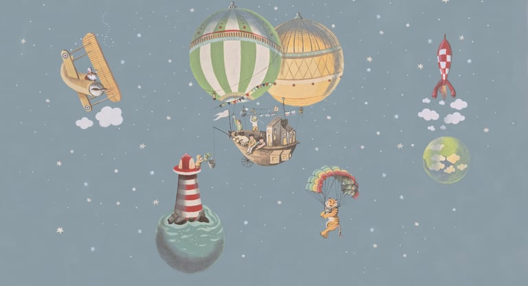 A balloon ship with a parachutist, an airplane, and a rocket among the stars