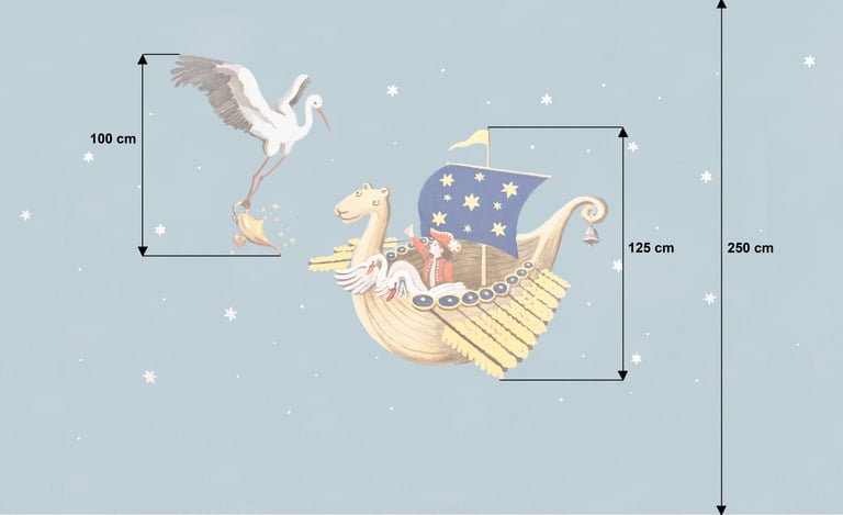 The dimensions of the painting can be adapted to the actual dimensions of the room. It is even possible to divide the scene onto two adjacent walls to give the painting a three-dimensional appearance.