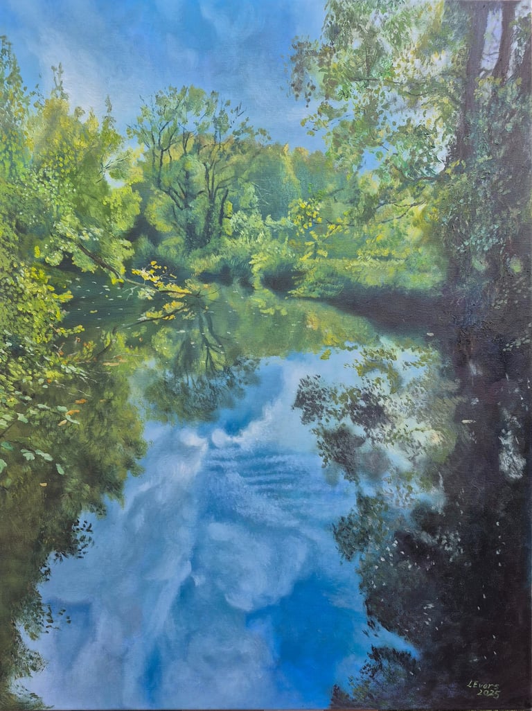 Blue and golden reflections on the river's surface